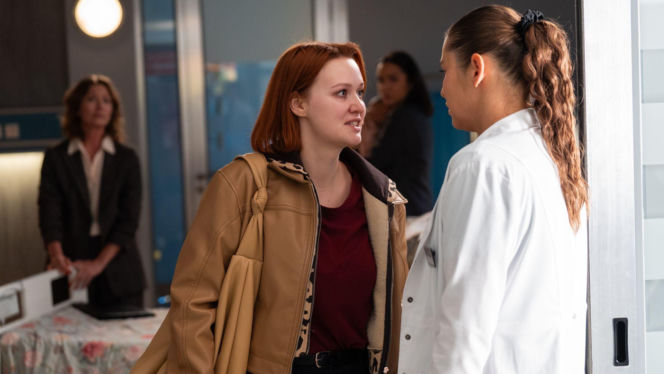Weronika Walasiewicz (Klemi) w jasnobrązowej kurtce z podszewką w panterkę i Anna Szymańczyk (Iga) w białym lekarskim fartuchu dyskutują w Leśnej Górze, natomiast z tyłu widoczna jest Paulina Napora (kuratorka). O zemście Klemi na Idze przeczytasz na stronie Super Seriale.