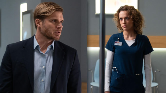 Maksa Beger (Tomasz Ciachorowski) w granatowym garniturze i Julka Burska (Aleksandra Hamakło) w uniformie medycznym ze zdziwioną miną, w kadrze szpitalnej. Dramatyczna decyzja Julki dotycząca błędu medycznego Igi w "Na dobre i na złe" – więcej o tym na Super Seriale.