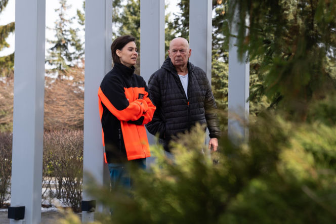 Pola Gonciarz (Blanka) i Piotr Garlicki (Stefan Tretter) stoją na zewnątrz, ona w kurtce czarno-pomarańczowej ze skrzyżowanymi rękami, on w czarnej puchówce, patrząc w bok z zatroskaniem. Scena z serialu "Na dobre i na złe", o którym przeczytasz więcej na Super Seriale.