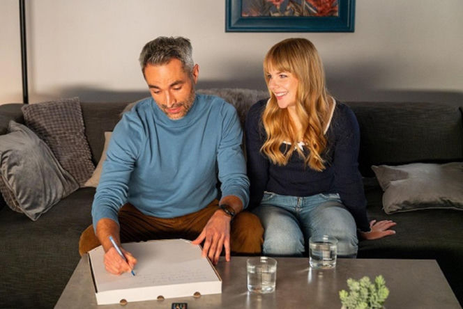 Beniamin Vick (Hubert Jarczak) w niebieskim golfie i brązowych spodniach pisze na pudełku po pizzy, Basia (Anna Wysocka-Jaworska) w swetrze i jeansach patrzy na niego z uśmiechem. Siedzą na kanapie, przed nimi dwa szklanki wody i roślinka, w tle poduszki i obraz. Więcej o ich decyzjach w "Na sygnale" na Super Seriale.