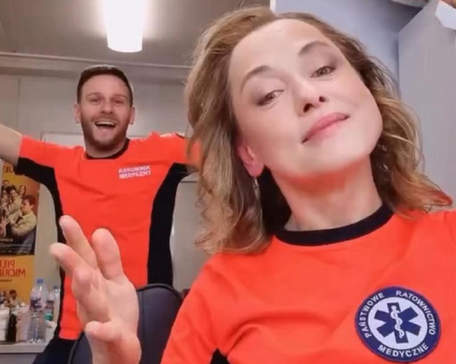 Anna Haba i Wojciech Zygmunt, aktorzy z serialu "Na sygnale", w pomarańczowych koszulkach ratowników medycznych. Haba na pierwszym planie, uśmiecha się do obiektywu, Zygmunt w tle z otwartymi ramionami. O ich powrocie do obsady przeczytasz na portalu Super Seriale.