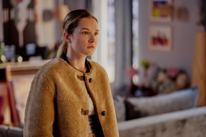 Kasia ze "Na Wspólnej", wyraźnie zasmucona i rozczarowana, w beżowym płaszczu. Jej wyraz twarzy sugeruje poważne rozważania o rozwodzie z Darkiem, co jest tematem odcinka 4165. Więcej o dramatycznych zwrotach akcji w serialu przeczytasz na stronie Super Seriale.