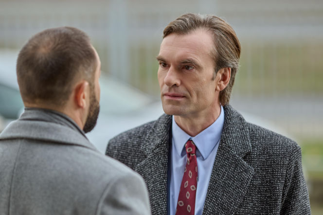 Mężczyzna w eleganckim płaszczu i krawacie patrzy z powagą na drugiego, brodatego mężczyznę, którego widać od tyłu, co sugeruje napiętą rozmowę. Scena odzwierciedla intrygi i dramaty z serialu "Na Wspólnej", o którym można przeczytać na portalu Super Seriale.