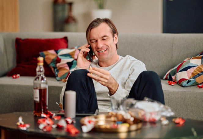 Mariusz (Piotr Cyrwus) w szarym swetrze i ciemnych spodniach, siedzi na podłodze, oparty o szarą kanapę, z uśmiechem rozmawia przez telefon. Na stoliku przed nim widoczna butelka alkoholu, słodycze i szklanka, co odzwierciedla jego problemy z nałogiem. Więcej o losach bohatera na Super Seriale.