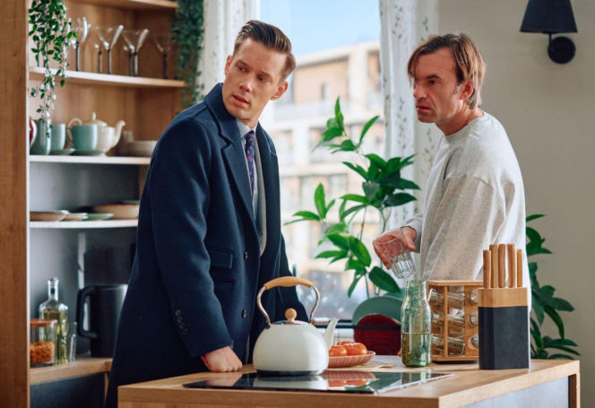 Dwóch mężczyzn w kuchni, jeden w garniturze i płaszczu, drugi w szarej bluzie, trzymający szklankę. Wyrażają poważne miny, a scena sugeruje dyskusję o problemach z karierą i alkoholem Mariusza w serialu "Na Wspólnej", o czym przeczytasz więcej na portalu Super Seriale.