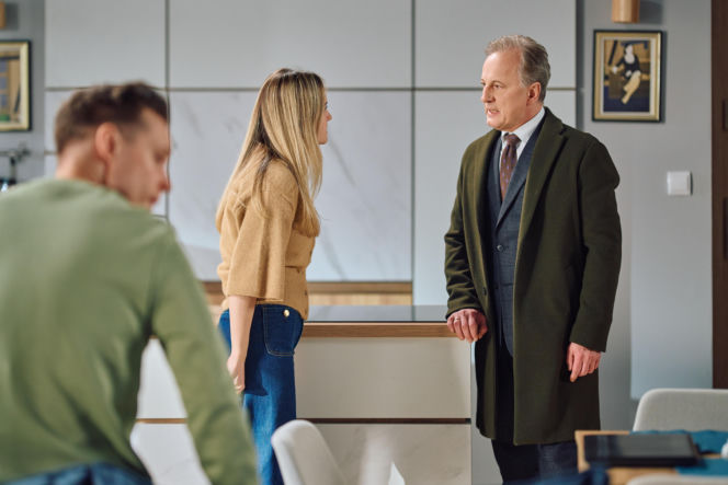 Trzy osoby w nowoczesnej kuchni, w tym mężczyzna w oliwkowym płaszczu i kobieta w brązowym swetrze, z trzecim mężczyzną na pierwszym planie, prawdopodobnie Darek. Scena z serialu "Na Wspólnej" 4181, gdzie Darek zostaje oskarżony o kradzież z kancelarii, a o tych emocjonujących wydarzeniach możesz przeczytać na Super Seriale.
