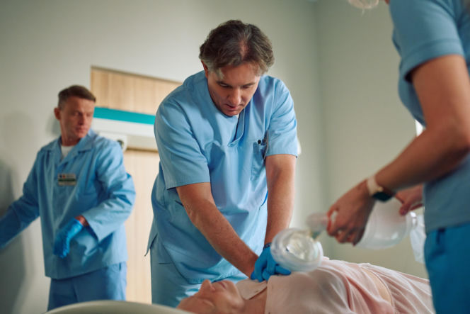 Zespół medyczny w niebieskich strojach, w tym mężczyzna wykonujący resuscytację krążeniowo-oddechową, a kobieta używająca maski ambu na pacjentce, podczas dramatycznej walki o życie profesor Agier z serialu "Na Wspólnej". Więcej o tym na Super Seriale.