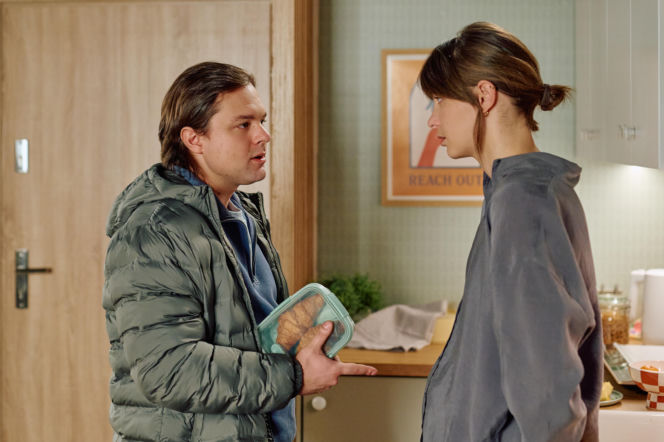 Remigiusz, ubrany w zieloną puchową kurtkę, rozmawia z kobietą w kuchni, trzymając w ręku pojemnik z dwoma rogalikami. Oboje stoją naprzeciwko siebie, a w tle widać jasne meble kuchenne i obraz z napisem "REACH OUT". Więcej o losach bohaterów na Super Seriale.