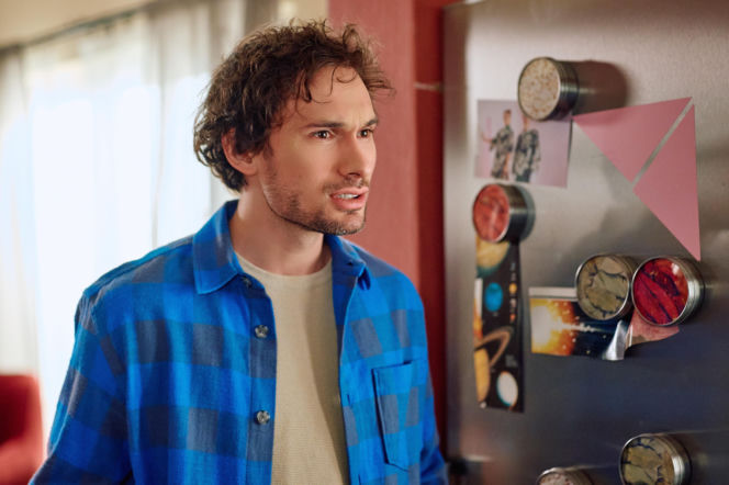 Mężczyzna z kręconymi włosami w niebieskiej koszuli w kratę i beżowym podkoszulku, patrzący w bok z zaniepokojeniem, stoi przy lodówce ozdobionej magnesami i notatkami. Scena z serialu "Na Wspólnej", pełna napięcia. Więcej informacji o serialu znajdziesz na Super Seriale.