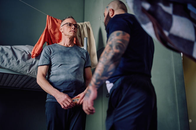 Dwóch mężczyzn w celi więziennej, jeden starszy w okularach, drugi młodszy z tatuażami. Starszy mężczyzna stoi z rękami skrzyżowanymi, patrząc w bok, obok piętrowe łóżko i wiszące ubrania. To scena z odcinka 4206 "Na Wspólnej", o którym przeczytasz więcej na portalu Super Seriale.