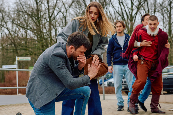 Przerażona Eliza wspiera klęczącego Bartka, który zasłania usta ręką, a w tle Junior w kostiumie teatralnym z trudem jest powstrzymywany przez dorosłego mężczyznę. Scena ze "Na Wspólnej", gdzie dojdzie do dramatycznego starcia podczas przedstawienia, dostępna w Super Seriale.