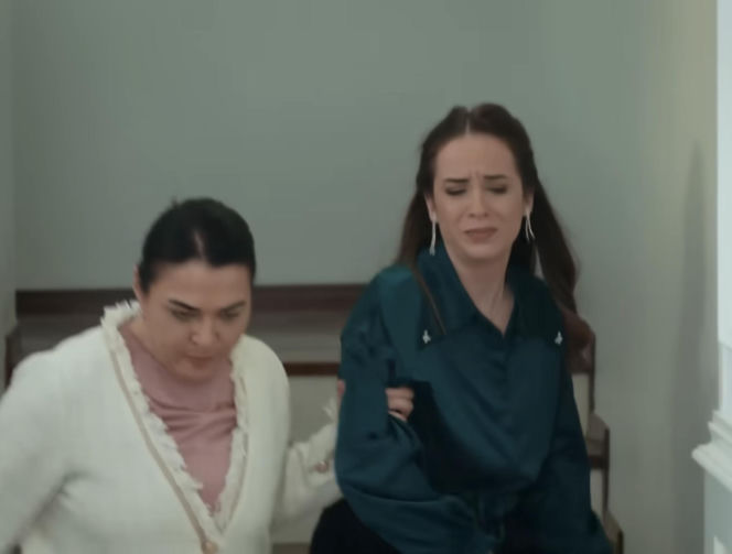 Kobiety w scenie z serialu "Panna młoda", z których jedna jest wyraźnie smutna i płacze, a druga (Mukadder) wydaje się ją wyprowadzać. Emocjonalna scena wyrzucenia Beyzy z rezydencji Develioglu, którą opisują Super Seriale.