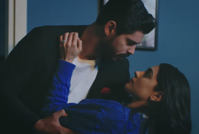 Cihan trzymający Hancer w ramionach, ich twarze są blisko, spojrzenia intensywne, oboje mają ciemne włosy, Hancer ma na sobie niebieski sweter, a Cihan ciemną marynarkę, białą koszulkę i poszetkę. Scena z serialu "Panna młoda" zwiastuje przełom w ich relacji, o czym przeczytasz na Super Seriale.