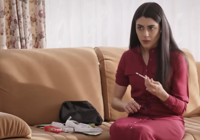 Młoda kobieta, Hancer, w bordowej sukience siedzi na beżowej kanapie, trzymając strzykawkę z niepokojem. Na kanapie obok niej leżą pudełka z lekami i czarna kosmetyczka. Scena z serialu "Panna młoda", gdzie Hancer ma być oszukana i być może bezpłodna. Więcej o intrygach w Super Seriale.