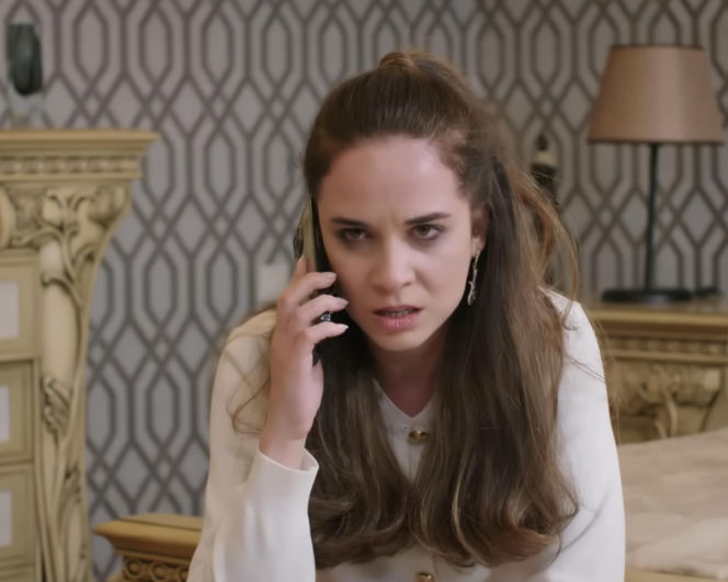 Portret Beyzy, bohaterki serialu "Panna młoda", z poważną miną rozmawiającej przez telefon w pomieszczeniu o wzorzystej tapecie. Z jej wyrazu twarzy wynika duże zdenerwowanie, co doskonale oddaje emocje z najnowszych odcinków serialu "Super Seriale".
