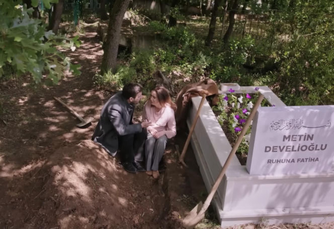 Cihan i Hancer na cmentarzu, siedzą w wykopanym grobie obok nagrobka z napisem "Metin Develioğlu". Obok nich leżą dwie łopaty. W tle widać drzewa i zarośla. Scena z serialu "Panna młoda", o której więcej dowiesz się na Super Seriale.