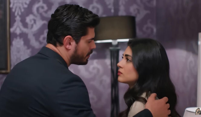 Cihan, mężczyzna o ciemnych włosach i brodzie, spogląda na Hancer, kobietę o długich, ciemnych włosach, w eleganckim wnętrzu z tapetą w fioletowe wzory. Oboje patrzą na siebie z powagą. Ta scena z pewnością wywoła wiele emocji, o czym możesz przeczytać na Super Seriale.
