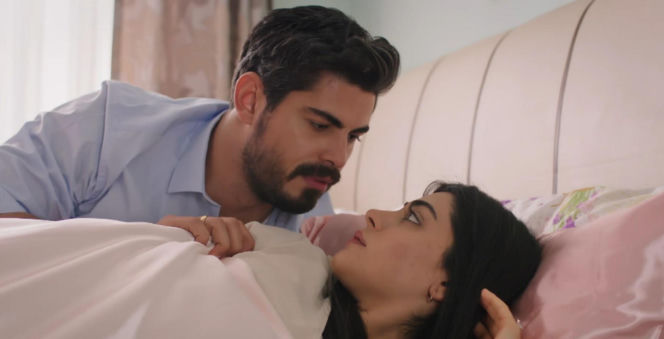 Intensywne spojrzenie Cihana na Hancer w łóżku, gdy oboje leżą pod białą pościelą. On ma jasnoniebieską koszulę, ona ciemne włosy rozłożone na poduszce. Zdjęcie przedstawia scenę z odcinków tureckiego serialu "Panna Młoda" dostępnego na Super Seriale.