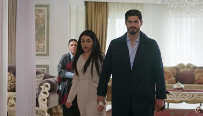Cihan i Hancer, bohaterowie tureckiego serialu "Panna młoda", wychodzą z luksusowego pomieszczenia, za nimi w tle widać kobietę. Cihan w ciemnym płaszczu z jasną koszulą pod spodem, Hancer w jasnym kombinezonie. Więcej o ich losach na Super Seriale.