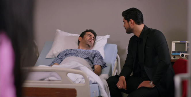 Cihan rozmawia z Cemilem leżącym w szpitalnym łóżku w piżamie, próbując go przekonać do operacji ratującej życie. Scena podkreśla dramatyczne wydarzenia z tureckiego serialu "Panna młoda", o których dowiesz się więcej na Super Seriale.
