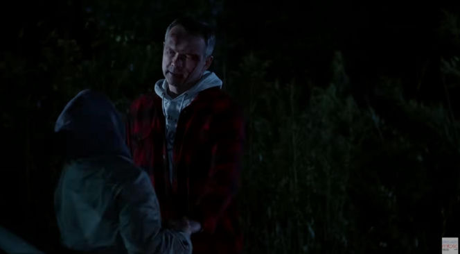 Lesław Żurek jako Mateusz Stik w serialu "Pierwsza miłość" z ranami na twarzy, stoi naprzeciwko postaci z kapturem, w ciemnym lesie nocą. Scena zwiastuje dramatyczne wydarzenia, które opisujemy na portalu Super Seriale.