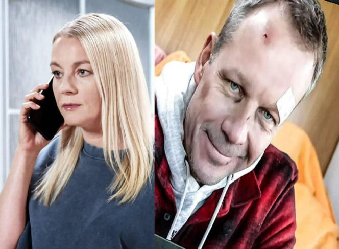 Kolorowe zdjęcie przedstawiające kolaż: po lewej Emilka (Anna Ilczuk) w ciemnej bluzce rozmawia przez telefon, po prawej Mateusz Stik (Lesław Żurek) z uśmiechem na twarzy, mający ranę na czole i plaster. Opis szczegółów odcinka „Pierwszej miłości” znajdziesz na Super Seriale.