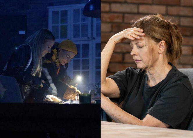 Dwie kobiety, Dominika i Karma, świecą latarką na przedmioty na stole, prawdopodobnie w domu Izabeli, podczas gdy z boku widać zasmuconą kobietę z dłonią na czole. Ta dramatyczna scena z serialu "Pierwsza miłość" zapowiada szokujące odkrycie, które zmieni ich plany. Więcej o ich losach na Super Seriale.