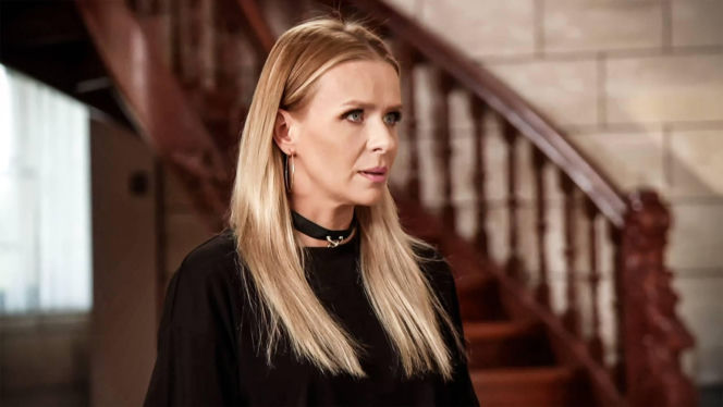 Blondwłosa Aneta Zając jako Dominika, patrząca w prawo z zaniepokojeniem, ma na sobie czarną bluzkę i choker, w tle widać drewniane schody. O losach Dominiki w serialu "Pierwsza miłość" przeczytasz na Super Seriale.