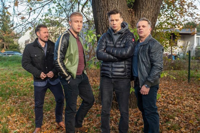 Czterech mężczyzn w ciemnych kurtkach, w tym Piotrek i Hubert, stoją w lesie pod drzewem, analizując ślady psychopaty Mateusza w serialu "Pierwsza miłość". Dalsze informacje o bohaterach dostępne na Super Seriale.