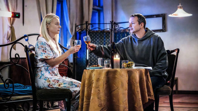 Mateusz i Emilka z serialu "Pierwsza miłość" siedzą przy stole, wznosząc toast winem. Emilka ma na sobie kwiecistą sukienkę i wyraźnie widać niebieskie kajdanki na jej dłoni. W tle ciemne okno i stylizowane meble. Więcej o ich losach przeczytasz na Super Seriale.