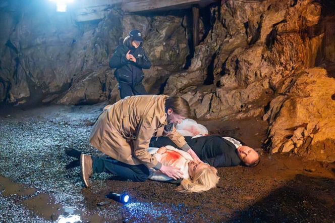 Fryderyk (Andrzej Kłak) pochylony nad Emilką (Anna Ilczuk) leżącą w zakrwawionej koszuli ślubnej obok Mateusza (Lesław Żurek), który również leży nieruchomo na ziemi. W tle widoczna policjantka i jaskinia. Dramatyczny finał wydarzeń w serialu "Pierwsza miłość" znajdziesz na Super Seriale.