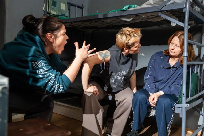 Trzy kobiety w więziennej celi. Jedna z lewej, w ciemnej bluzie z kapturem, krzyczy z otwartymi ustami i uniesionymi dłońmi w stronę kobiety z krótkimi, jasnymi włosami, siedzącej na łóżku piętrowym. Po prawej, Teresa (Maria Pakulnis) w dresie, siedzi na łóżku z opuszczoną głową, wyrażając bezradność, co wskazuje na znęcanie się. Więcej o losach bohaterów na Super Seriale.