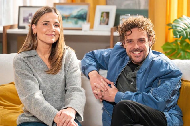 Marta, grana przez Annę Kózka-Barańską, siedzi obok Kamila, granego przez Michała Mikołajczaka, na jasnej kanapie. Marta ma na sobie szary sweter, a Kamil niebieską kurtkę. Oboje uśmiechają się do obiektywu, a za nimi widać fragment salonu z obrazami i rośliną. Więcej o ich losach na portalu Super Seriale.