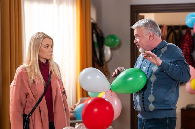 Emilka i Bartek w trakcie ostrej kłótni, stojący w pokoju wypełnionym kolorowymi balonami, co wskazuje na ważną okazję, zgodnie z opisem 4176. odcinka serialu "Pierwsza miłość". Więcej o losach bohaterów na portalu Super Seriale.
