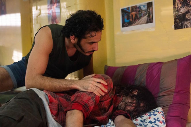 Mężczyzna z brodą i wąsem w ciemnej koszulce i szortach dotyka ramienia drugiego mężczyzny leżącego na łóżku w czerwono-czarnej koszuli w kratę. Drugi mężczyzna jest wyczerpany, ma długie, ciemne włosy, w tle widać żółtą ścianę z przyklejonymi zdjęciami. To scena z serialu "Pierwsza miłość", o której możesz przeczytać na Super Seriale.