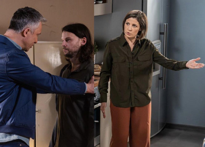 Kinga (Aleksandra Zienkiewicz) z serialu "Pierwsza miłość" rozmawia w kuchni, gestykulując ręką, podczas gdy w tle Janek (Maciej Mikołajczyk) obejmuje Pawła (Mateusz Kościukiewicz). Zdjęcie przedstawia dylemat Kingi związany z ratowaniem Pawła, o czym więcej przeczytasz na Super Seriale.