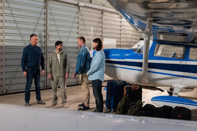 Pawel, Mateusz, Artur i Maciej w hangarze, stojący obok małego, biało-niebieskiego samolotu i bagaży, czekający na wylot z Kolumbii. Scena pełna napięcia z serialu "Pierwsza miłość", o której możesz przeczytać na Super Seriale.