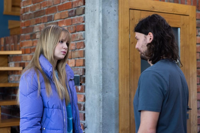 Młoda kobieta, Julka, z długimi blond włosami i w fioletowej kurtce, stoi naprzeciwko mężczyzny z długimi ciemnymi włosami, Pawła. Patrzą na siebie z powagą, scena ich pierwszego spotkania po powrocie Pawła z Kolumbii. Więcej o ich losach w "Super Seriale".