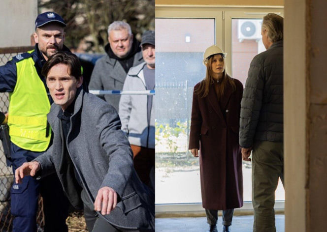 Kadr z serialu "Pierwsza miłość", po lewej Oskar (Filip Gurłacz) w szarym płaszczu z przerażeniem patrzy przed siebie, za nim policjant i inni mężczyźni. Po prawej Kalina (Magdalena Wieczorek) w kasku budowlanym i długim płaszczu stoi naprzeciwko mężczyzny. Dramatyczne wydarzenia z serialu dostępne na Super Seriale.