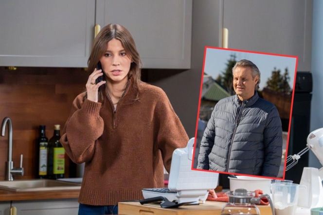 Młoda kobieta o jasnobrązowych włosach rozmawia przez telefon w kuchni, obok niej na zdjęciu w ramce mężczyzna w szarej kurtce. Kobieta jest pogrążona w rozmowie, obok niej wafelki. Zdjęcie ilustruje odcinek „Pierwszej Miłości”, gdzie Mikołaj mści się na Kalinie. Więcej o losach bohaterów przeczytasz na Super Seriale.