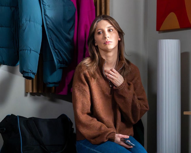 Mężczyzna o krótkich ciemnych włosach i niebieskich oczach, ubrany w kurtkę, siedzi w samochodzie, z widocznym na części twarzy pomarańczowym światłem, w tle rozmyte światła miasta nocą. Zdjęcie ilustruje emocje bohaterów serialu "Pierwsza miłość", o których można przeczytać na Super Seriale.
