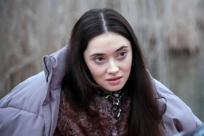 Kobieta z długimi, ciemnymi włosami w fioletowej puchowej kurtce i futerku, z zaniepokojoną miną, patrzy w bok. Scena prawdopodobnie przedstawia Angelikę z serialu "Pierwsza miłość" przed brutalnym porwaniem, o czym przeczytasz na Super Seriale.