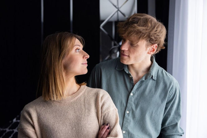 Julia Kamińska (Maja) w beżowym swetrze patrzy na Karola Biskupa (Radka) w zielonej koszuli, którzy stoją obok siebie w scenie z serialu "Pierwsza miłość". Więcej informacji o serialowych perypetiach bohaterów znajdziesz na Super Seriale.
