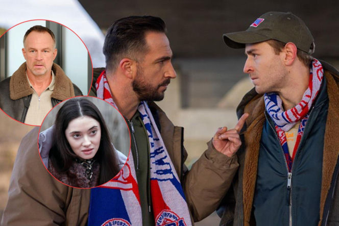 Złożone zdjęcie przedstawiające trzech bohaterów serialu „Pierwsza miłość”: Bolesława, Angelikę oraz dwóch mężczyzn z szalikami w czerwono-biało-niebieskie pasy, symbolizujące klub kibicowski. Całość oddaje napiętą atmosferę wokół wydarzeń z 4212. odcinka „Pierwszej miłości”, o których można przeczytać na portalu Super Seriale.