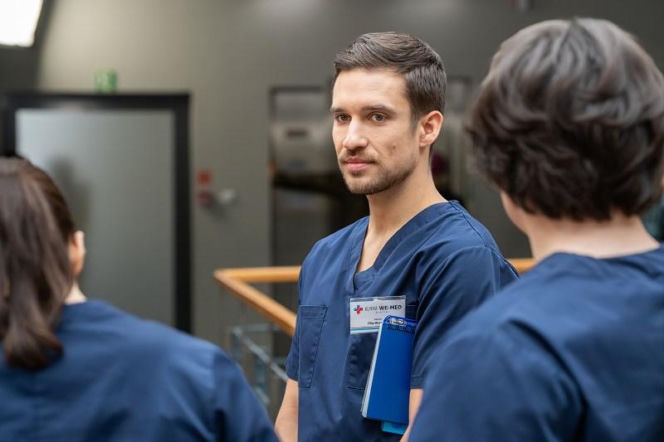 Mężczyzna w niebieskim uniformie medycznym z plakietką "Klinika WE-MED", z krótkimi, ciemnymi włosami i zarostem, stojący w pomieszczeniu, prawdopodobnie korytarzu kliniki. Obok niego, niewyraźne sylwetki dwóch innych osób. Artykuł o "Pierwszej miłości" i innych Super Seriale znajdziesz na naszym portalu.