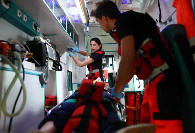 Ratowniczka medyczna Marta Galica (Klaudia Koścista) w niebieskich rękawiczkach, w czarnej koszulce i czerwonej kamizelce ratunkowej, pochylona nad apteczką w karetce, obok niej drugi ratownik, a na noszach leży pacjent. Więcej o losach Marty w "Super Seriale".