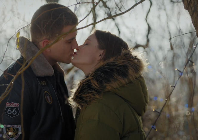 Majka i Mateusz z „M jak miłość” namiętnie całują się wśród gałęzi drzewa, co może być początkiem ich związku. W tle widać delikatne światełka, a na kurtce Mateusza naszywki Route 66 i Chivalry. O miłosnych perypetiach bohaterów przeczytasz na stronie Super Seriale.