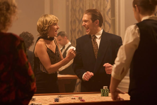 Zuza (Waleria Gorobets) i Budyń (Piotr Witkowski) z serialu "Wojna zastępcza" zadowoleni przy stole do ruletki. Zuza ma na sobie błyszczącą sukienkę, Budyń garnitur i krawat. Ich radosne miny nawiązują do ryzykownej misji w Berlinie, o której można przeczytać na Super Seriale.