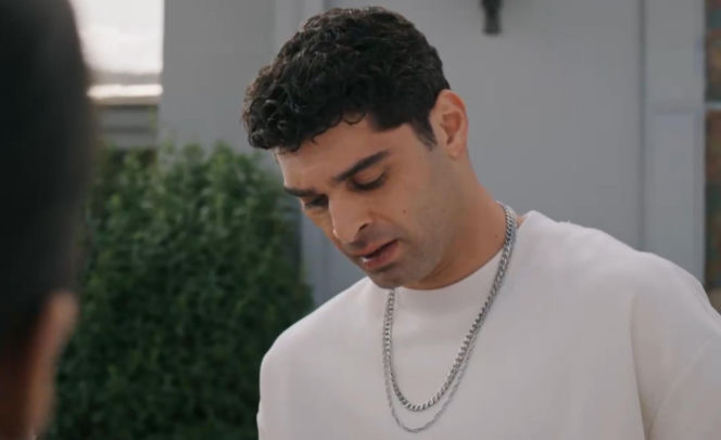 Portret Sinana z serialu "Złoty chłopak", zamyślonego mężczyzny o kręconych włosach i ciemnych oczach, ubranego w biały t-shirt z dwoma srebrnymi łańcuszkami, w tle rozmyta zieleń i fragment budynku, co zapowiada dramatyczne wydarzenia w 252. odcinku na Super Seriale.
