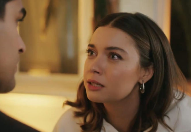 Zbliżenie na Seyran (Afra Saraçoğlu) ze "Złotego chłopaka" w emocjonalnej rozmowie z Feritem, patrząca z nadzieją i smutkiem. Jej twarz wyraża rozczarowanie słowami ukochanego, co oddaje dramatyczny kontekst 273. odcinka. Więcej o losach bohaterów na Super Seriale.